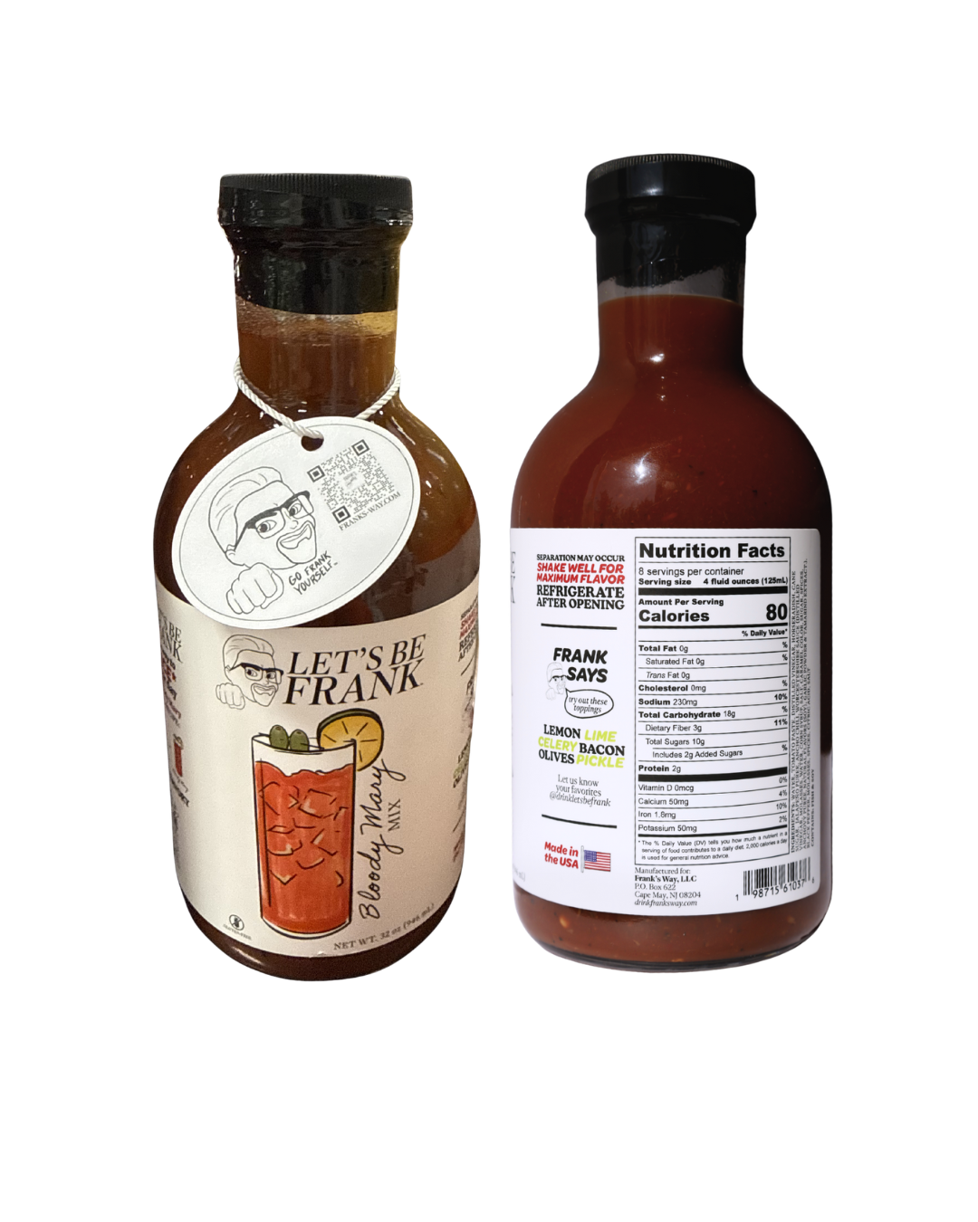 Zesty, flavorful, sublime—nothing beats the first crack of a fresh Frank's Way Bloody Mary bottle. Pour it into your glass, mix with your favorite liquor (like tequila for more of a Bloody Maria, perhaps?), and top it off with bacon, celery, olives, lime—whatever you’re craving. Feel your mouth watering?